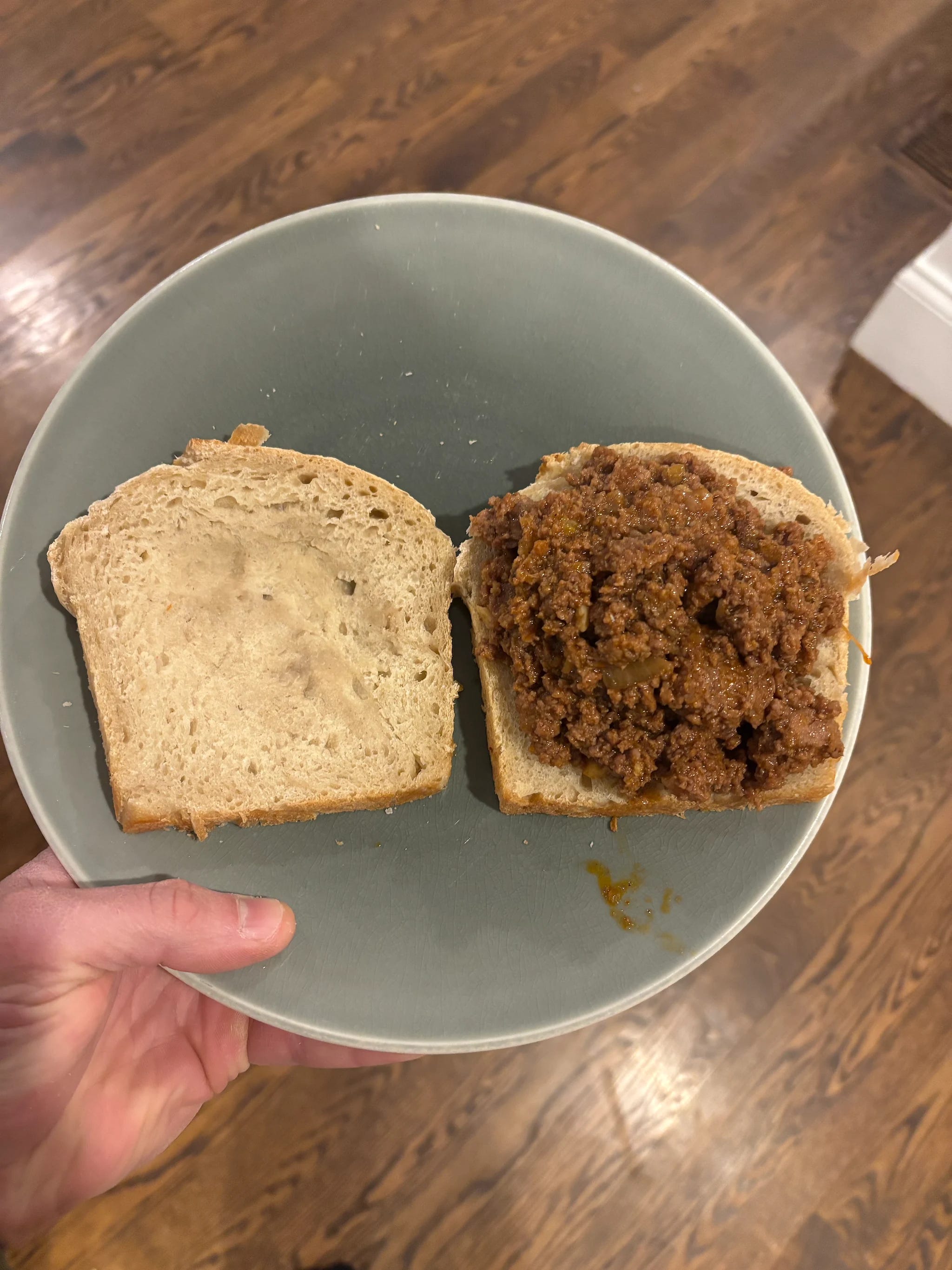 An old Pinemere trick: press down firmly onto the inner side of your bread, forming a pocket, allowing you to stuff more slop into your joe.